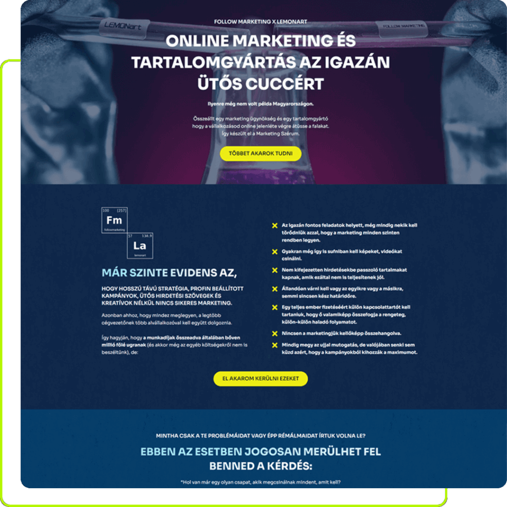 A sikeres marketingkampányok szíve a jól megtervezett landing oldal. Több éves tapasztalatunkkal segítünk olyan landing oldalt létrehozni, amely nemcsak gyönyörűen néz ki, hanem valódi eredményeket hoz. Tudjuk, hogy minden részlet számít, a megjelenéstől kezdve a funkcionalitáson át a felhasználói élményig.